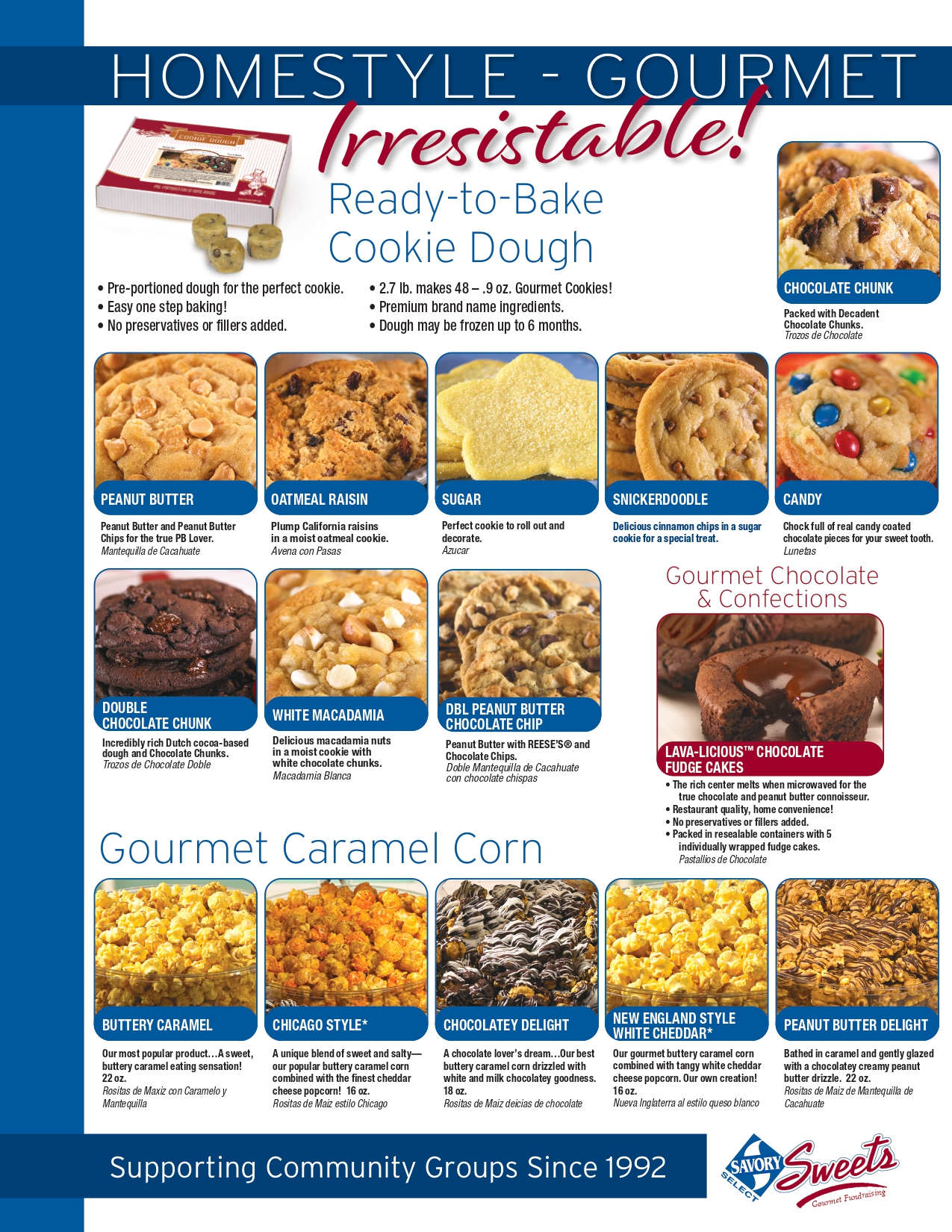 We offer gourmet cookie dough. Our home-style cookie dough offers generous portions of the highest quality ingredients and produced with the highest quality standards. Savory Sweets recipes remain unchanged after 25 years. In fact, we have never reduced the amount of “inclusions” in our products; meaning you still get the same amount of chocolate chips in each delicious bite. Our customers come back year after year -- many have used Savory Sweets for more than 15 years. Here are a just a few of the varieties available for your next fundraiser. View All Products